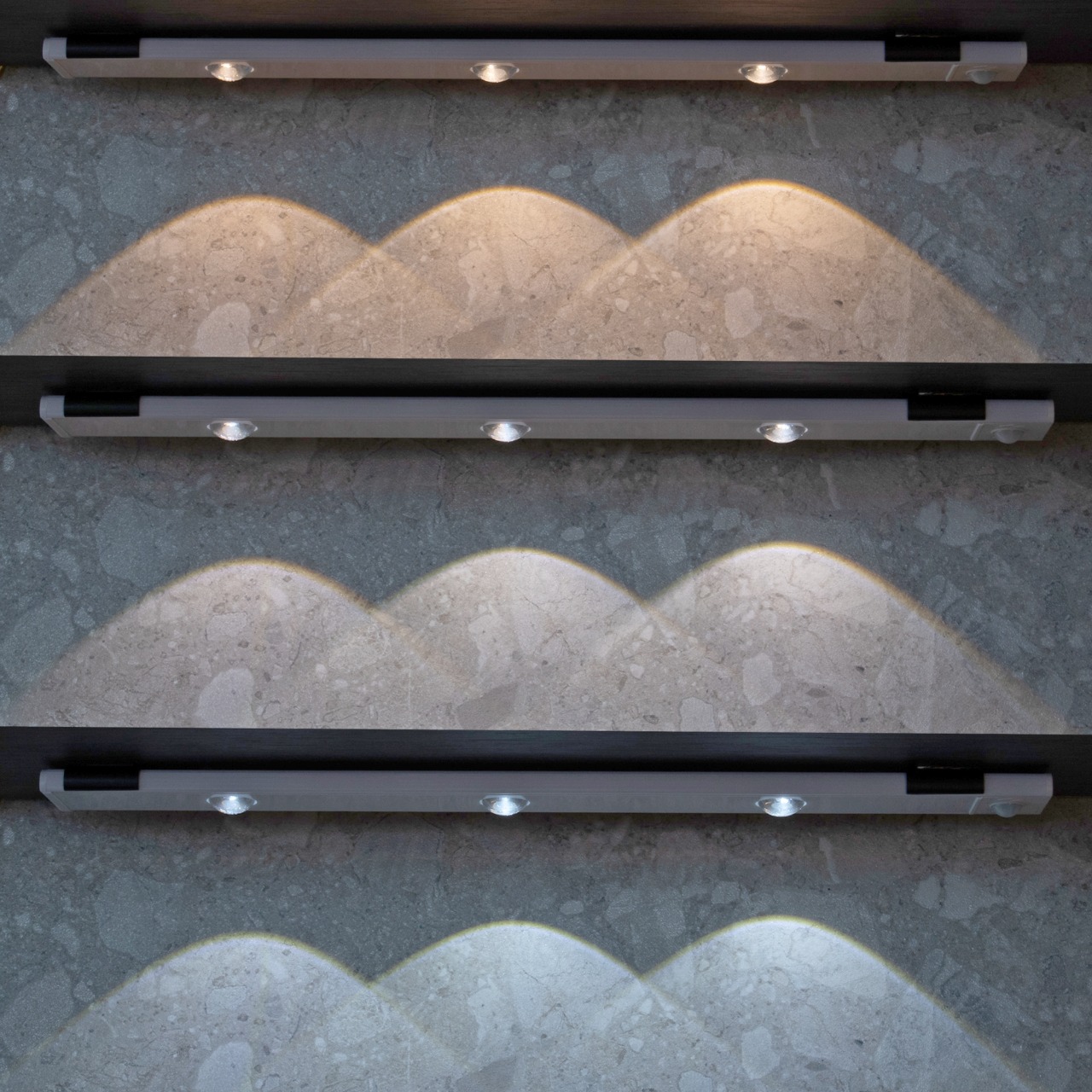 При монтаже вплотную к стене свет равномерно распределяется вдоль поверхности, формируя мягкую декоративную подсветку без резких контрастов. Такой вариант подходит для ниш, лестничных зон, вдоль стен или как ночное ориентационное освещение.
