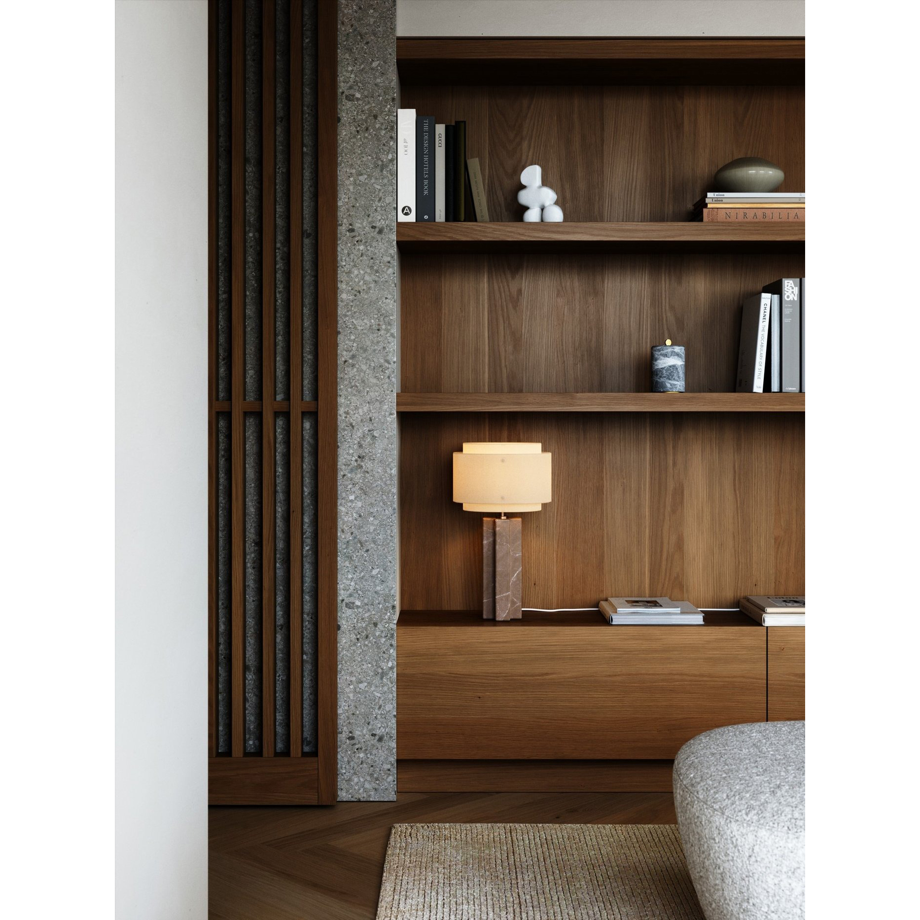 - Изысканный дизайн. Сочетание натурального мрамора и текстильного абажура создает современный и в то же время теплый образ.