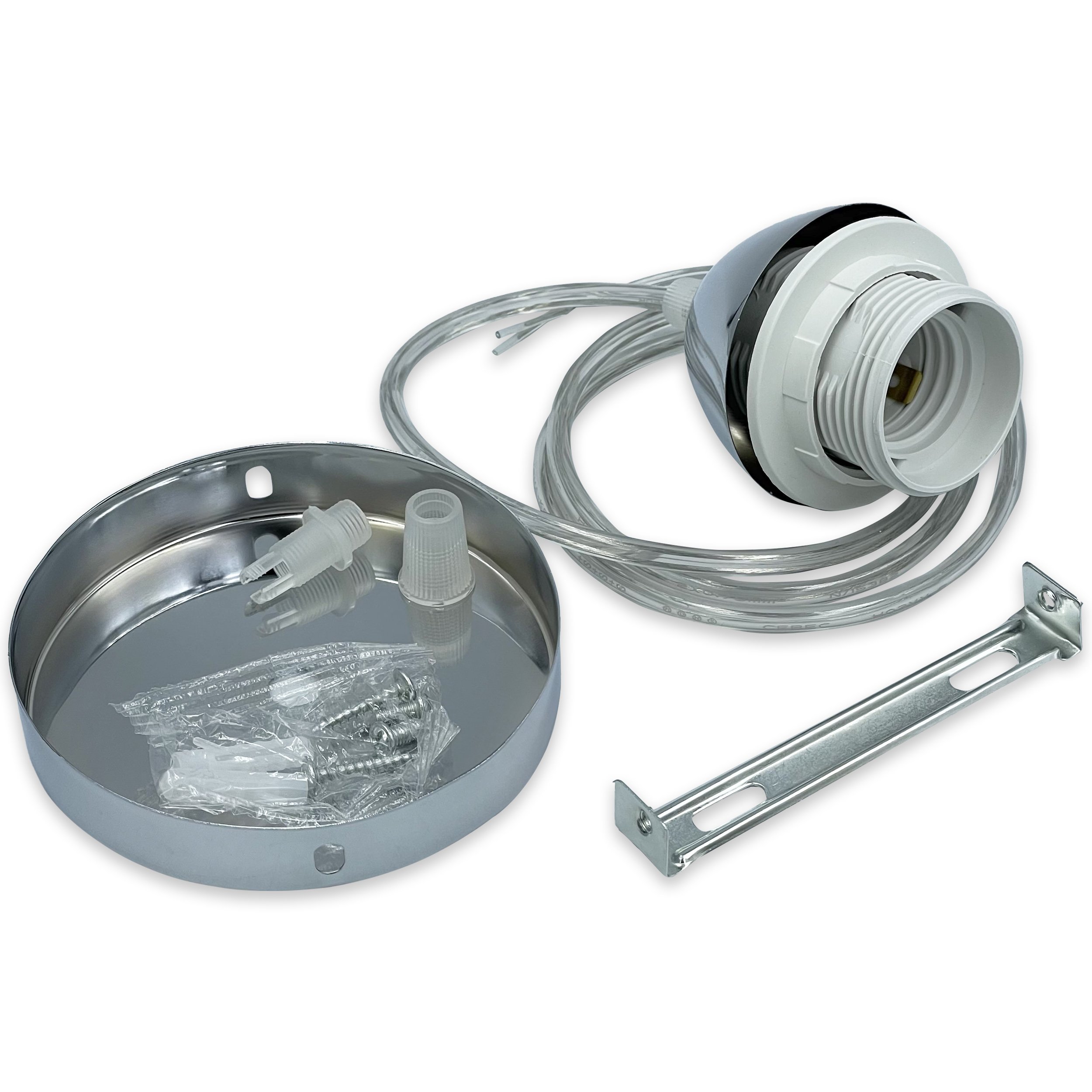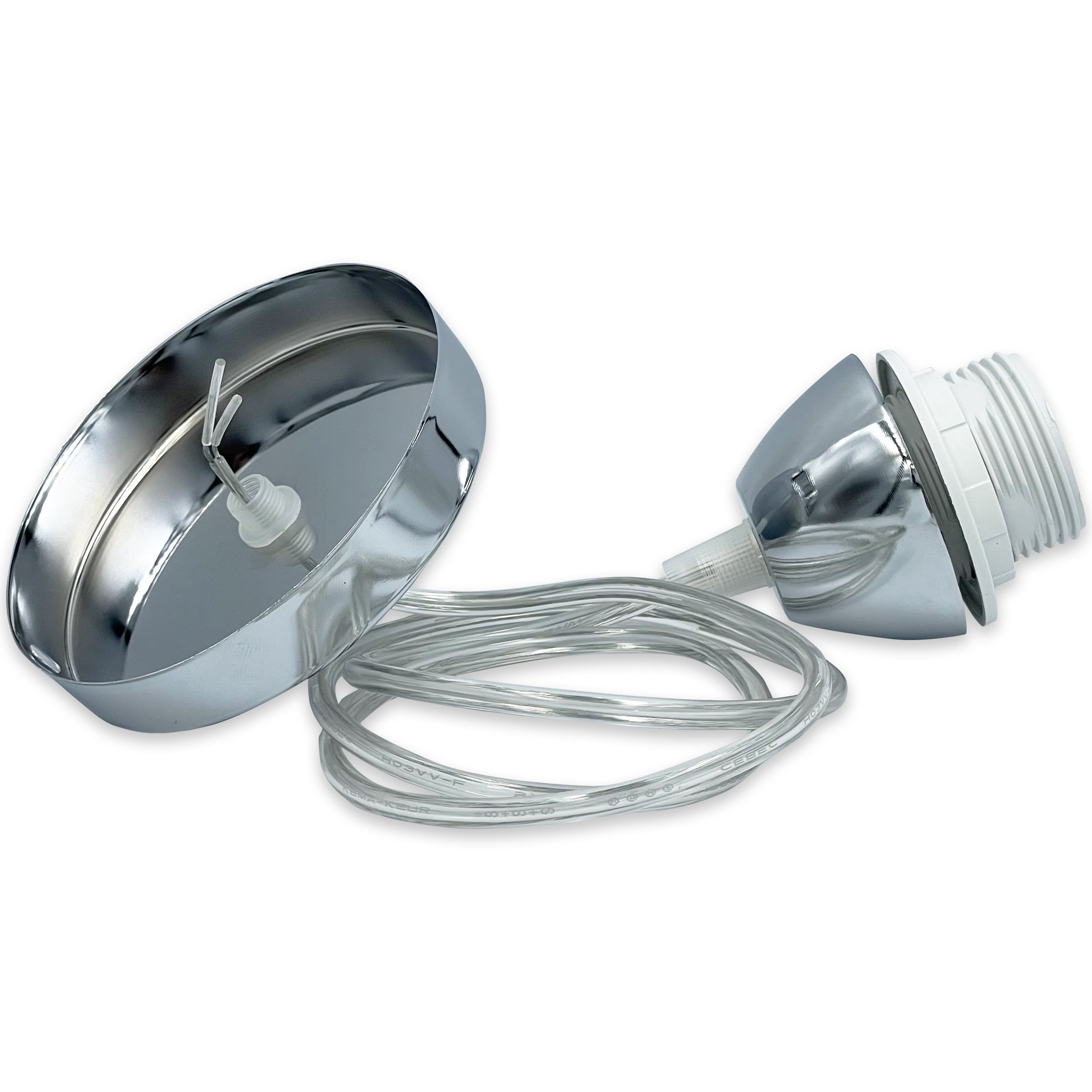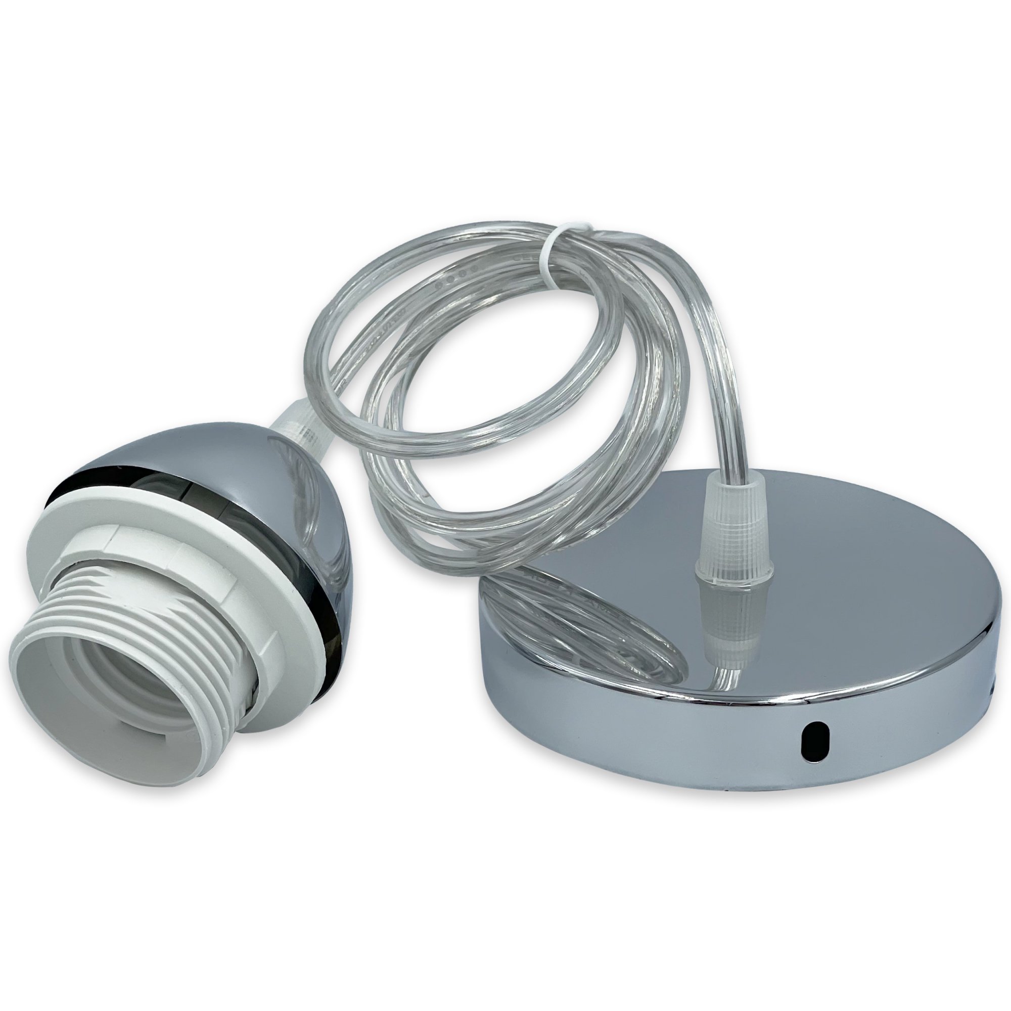 Патрон подвесной люстровый Е27 с креплением, металлическая основа, провод 1 м – надежный и стильный элемент для создания современного освещения. Подходит для использования с лампами с цоколем E27, что делает его универсальным решением для большинства светильников.