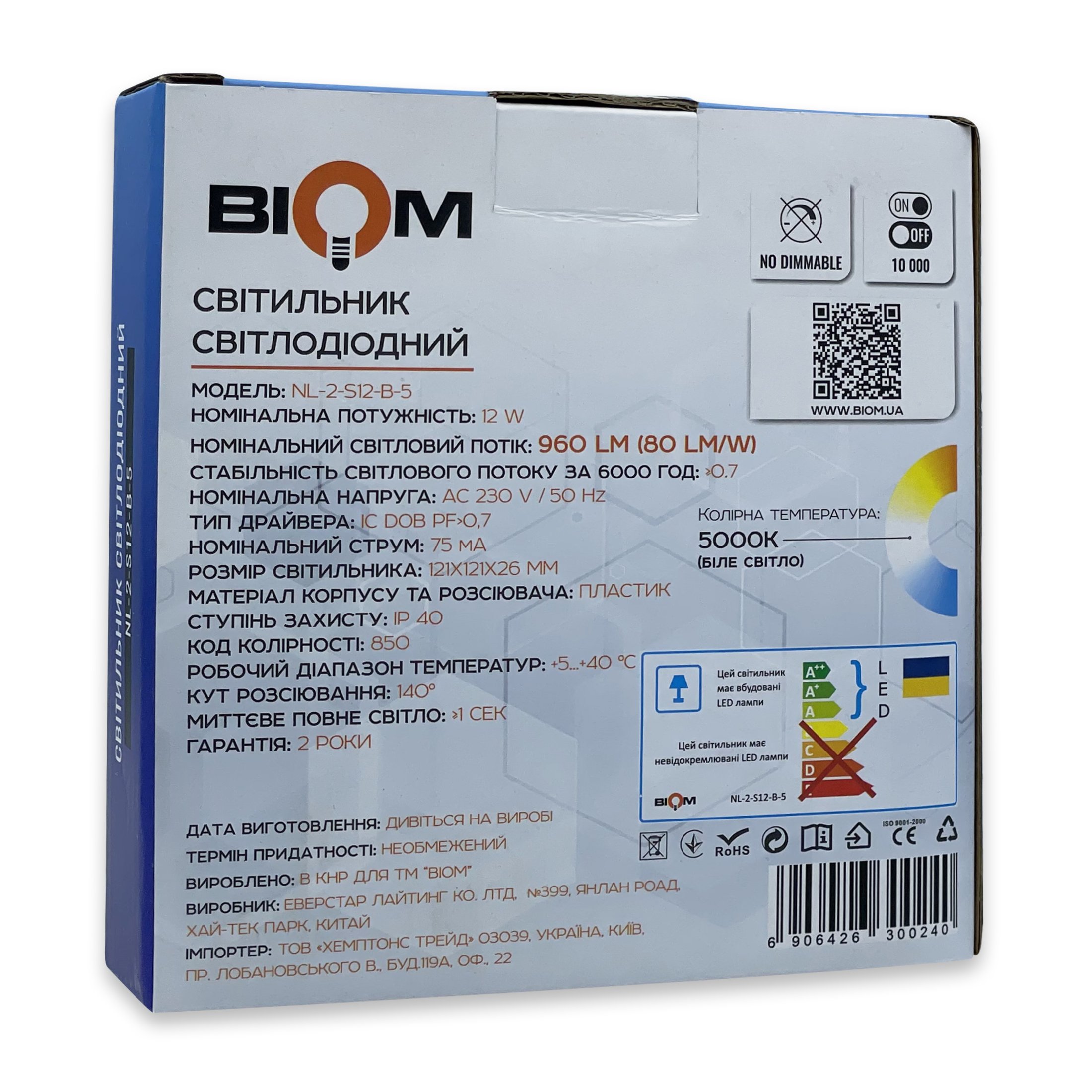 Светодиодный светильник BIOM NL-2-S12-B-5 квадрат, мощностью 12 Вт, идеально подходит для основного или дополнительного освещения жилых и коммерческих помещений. Его минималистичный черный дизайн гармонично вписывается в современные интерьеры, а равномерный нейтрально-белый свет создает комфортную атмосферу без мерцания.