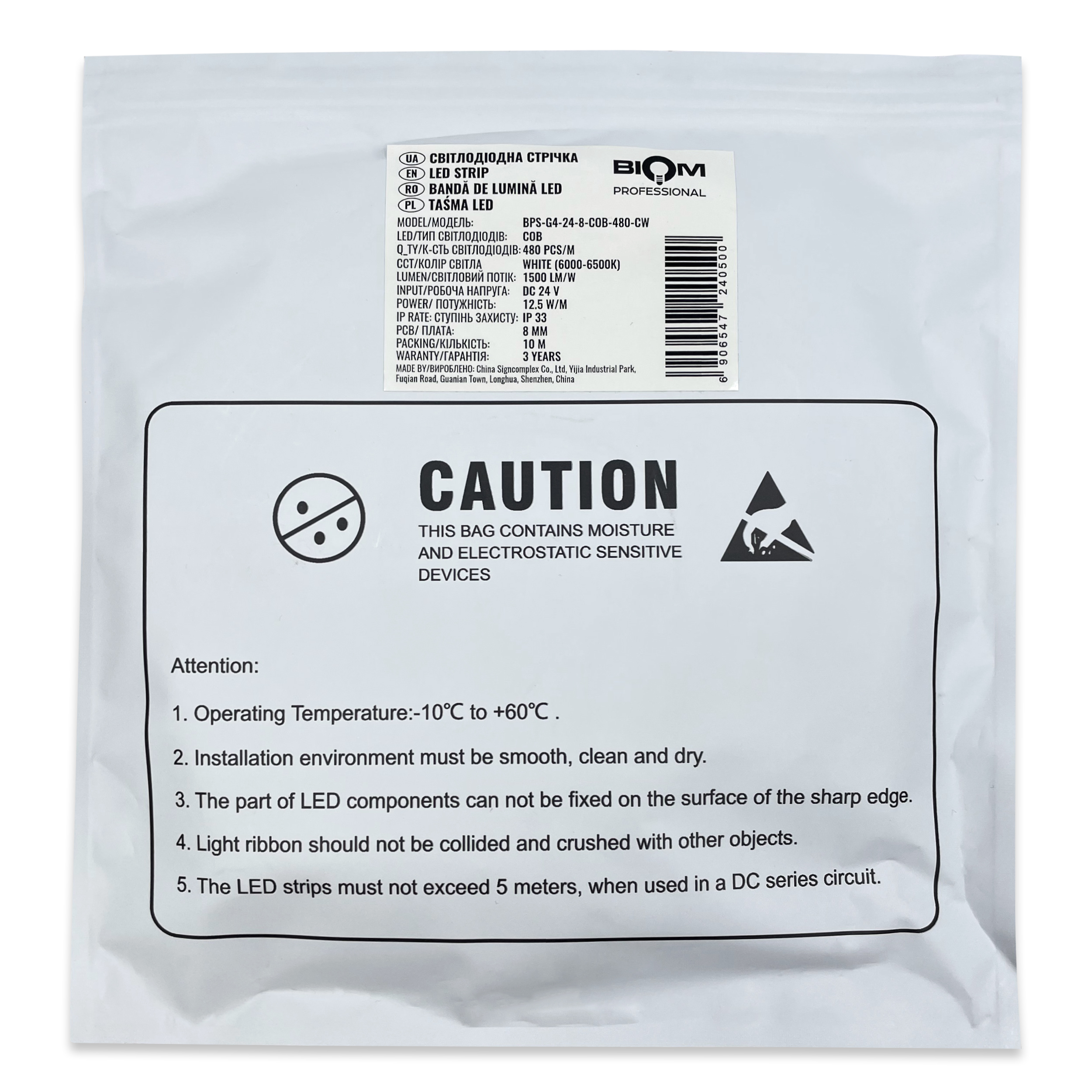 LED лента Biom Professional COB 480шт/м 12.5W/м IP33 24V (6000-6500K) BPS-G4-24-8-COB-480-CW-20 10 метров 27348