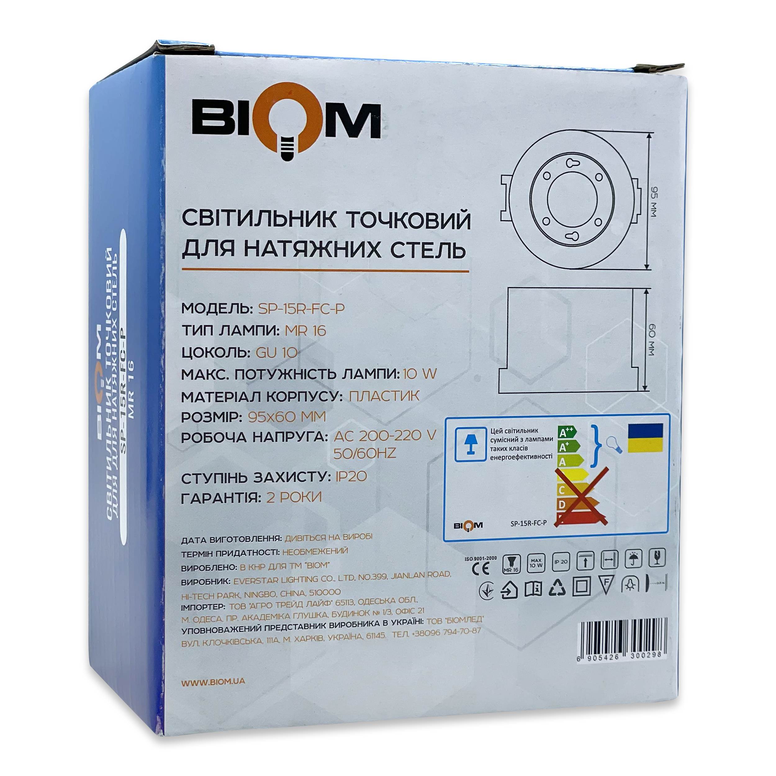 Точечный светильник Biom SP-15R-FC-P под LED лампу MR16/GU10 (без лампы), накладной - стильное и практичное решение для современного освещения интерьера. Подходит для установки в натяжных и подвесных потолках, обеспечивая мягкий и равномерный свет. Подойдет для освещения гостиных, спален, коридоров, офисов, магазинов и других помещений с натяжными или гипсокартонными потолками.