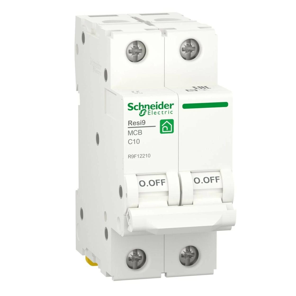 Мініатюрний автоматичний вимикач Resi9 - це 2-полюсний вимикач (обидва полюси захищенні), номінальним струмом 10A та кривою відключення C. Номінальна відключаюча здатність становить до 6000 А при напрузі 400 В АС відповідно до стандарту EN/МЕК 60898-1. Цей продукт відповідає стандарту EN/МЕК 60898-1. Автоматичний вимикач захищає коло від струму короткого замикання та перевантаження.