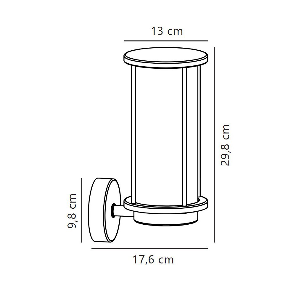 Світильник створений для тих, хто очікує стабільного освітлення і не хоче витрачати час на обслуговування. Конструкція проста, без поворотних елементів. Працює з лампами потужністю до 15 Вт (патрон E27), підтримує димування — можна регулювати освітлення відповідно до ситуації. Плафон має циліндричну форму, зроблений з пластику, основа — метал. Монтується як настінний бра, підходить для підсвітки фасаду.