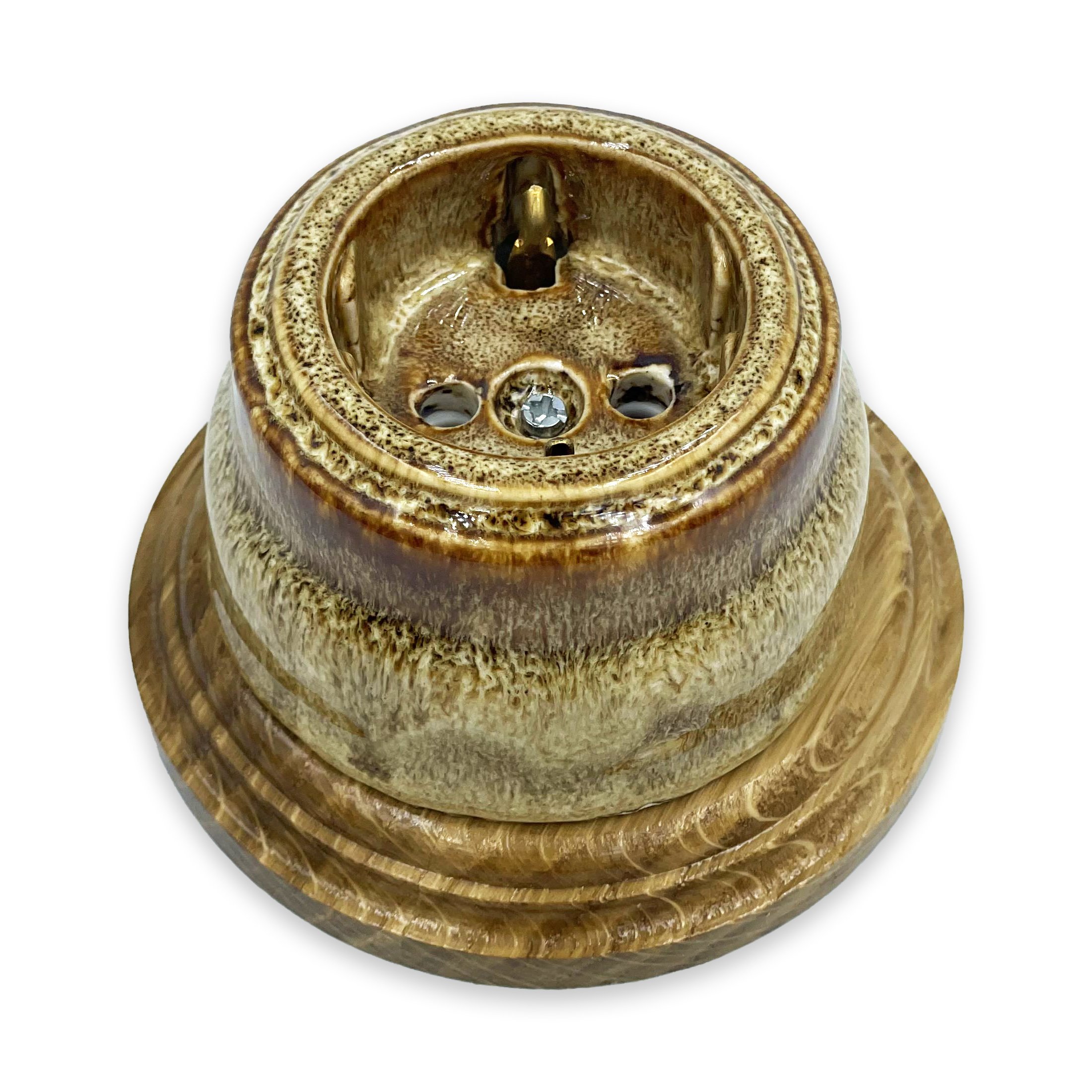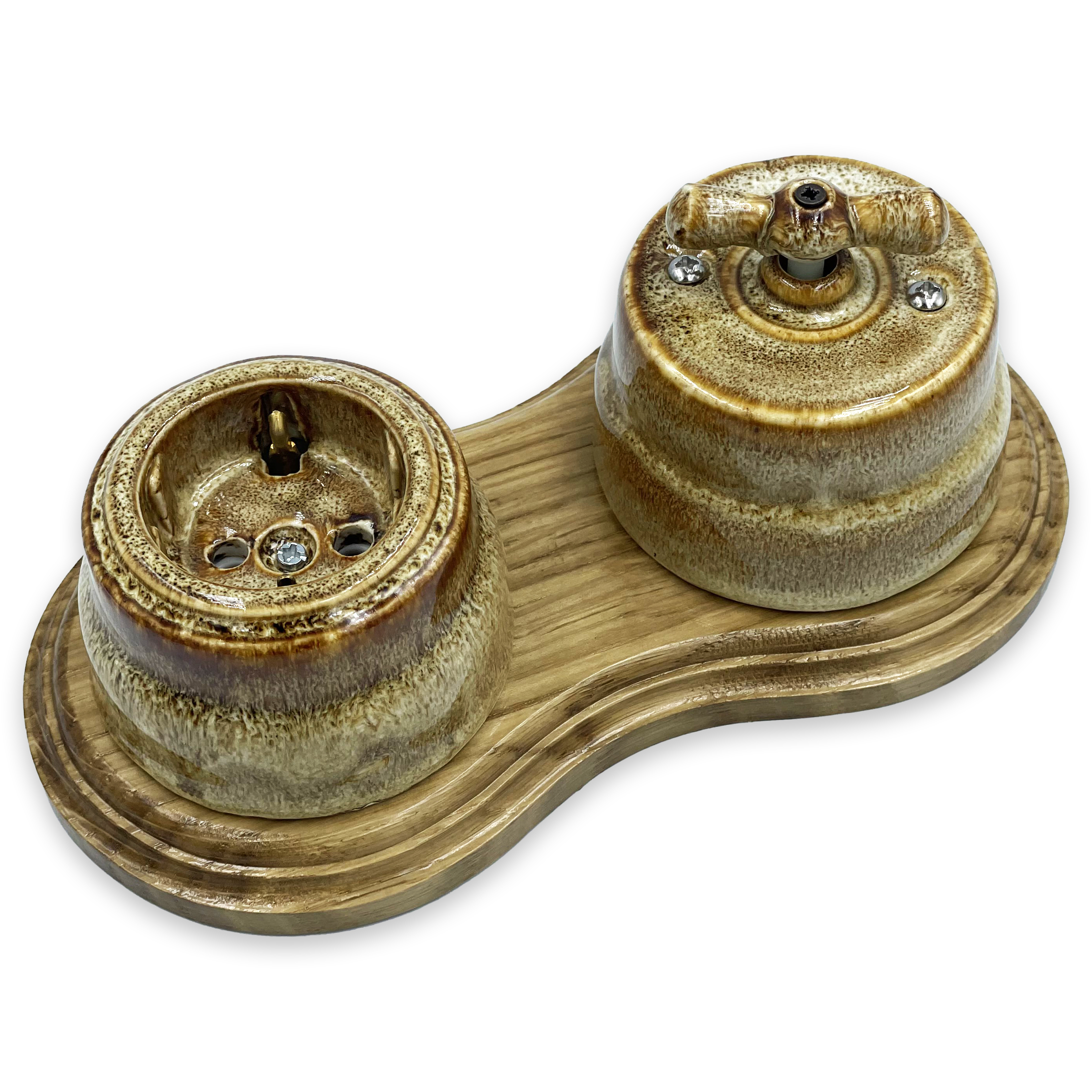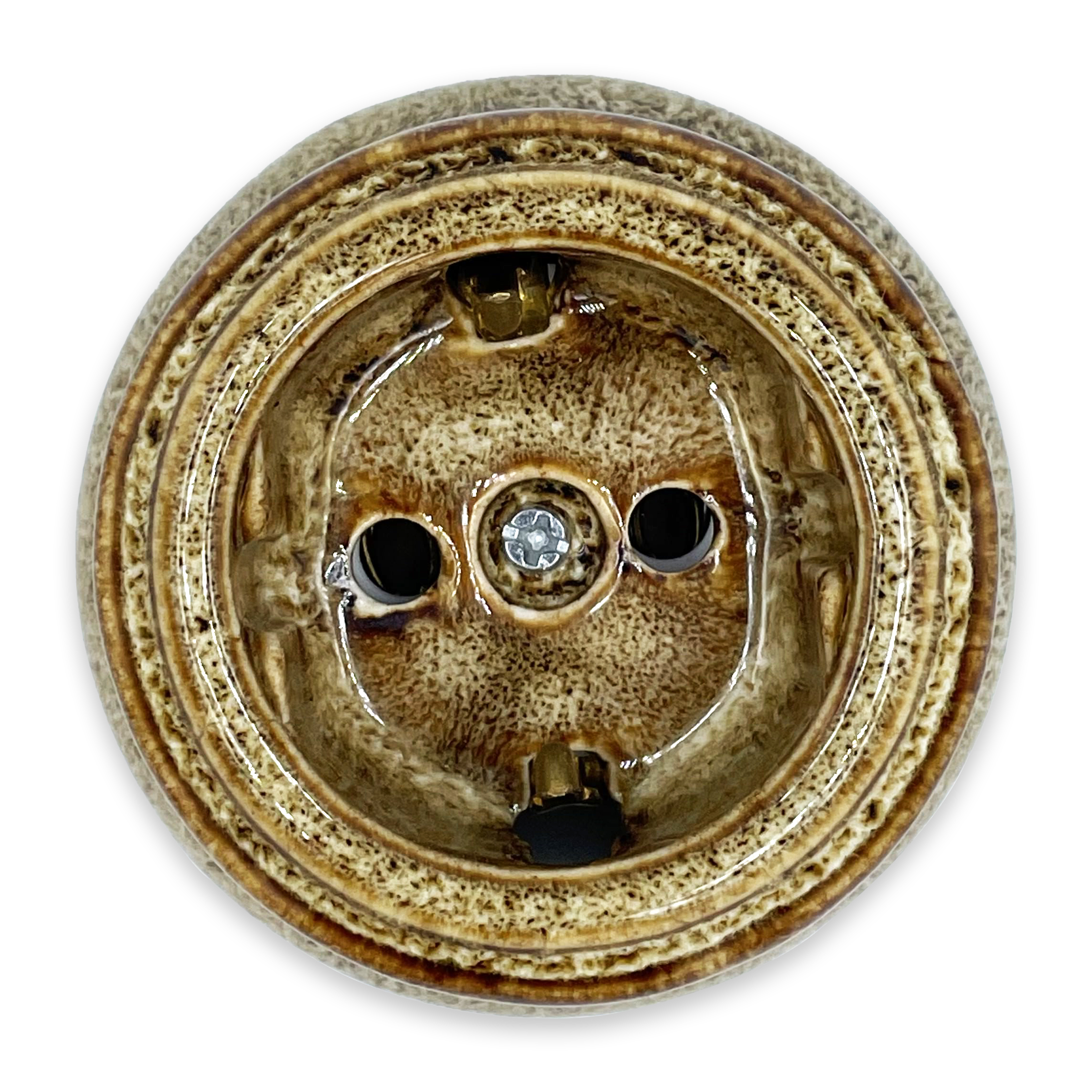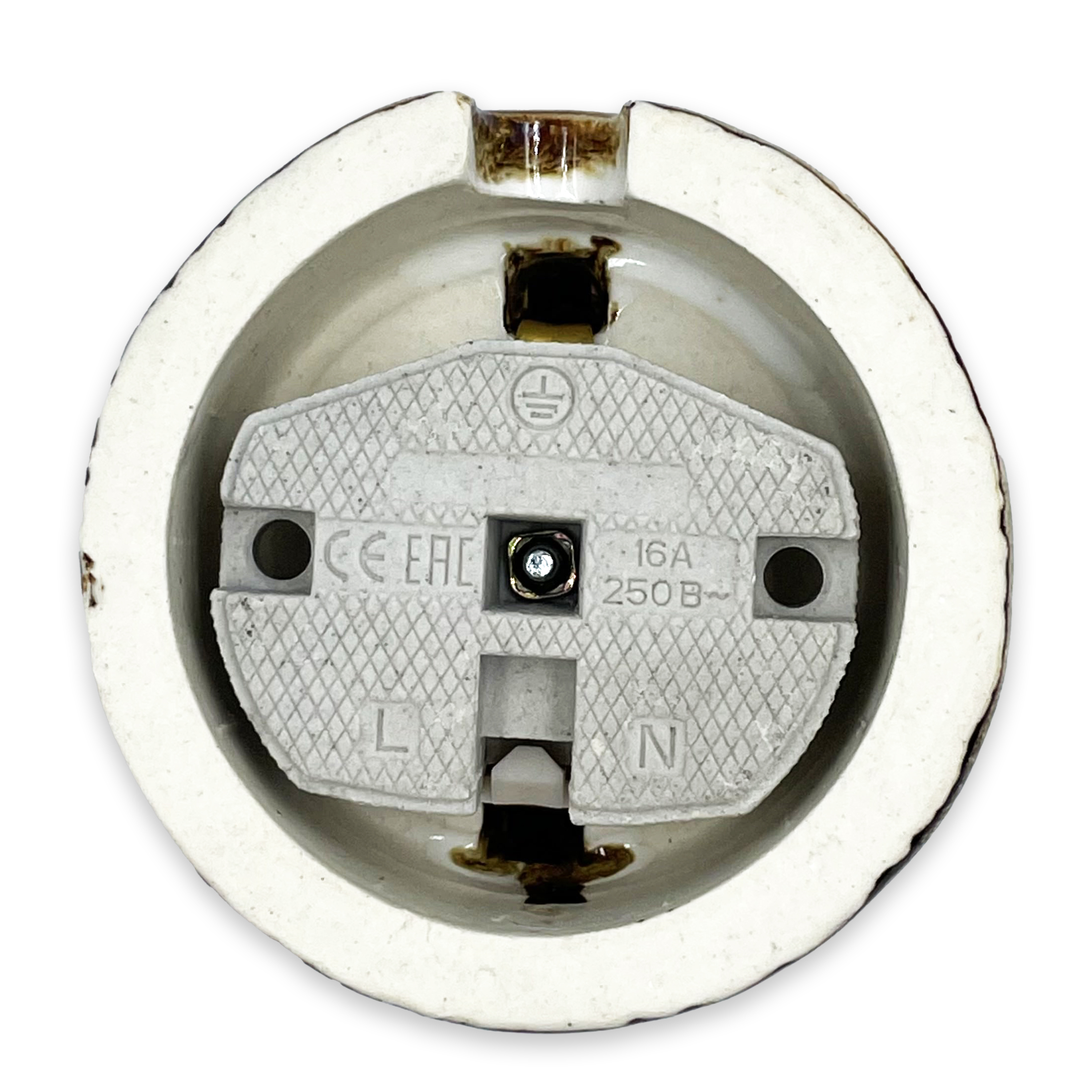 Корпус розетки виконаний із міцної кераміки, що забезпечує довговічність та стійкість до перегріву. Внутрішня частина виготовлена з якісного пластику та оснащена мідною контактною групою із заземлюючими контактами, що гарантує безпечне підключення побутових і освітлювальних приладів.