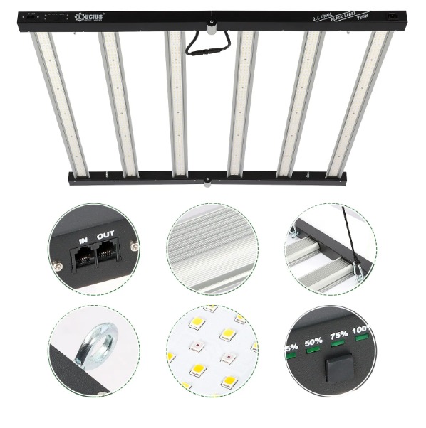 Вбудований димер дозволяє регулювати потужність від 180 до 660 Вт і відповідно яскравість залежно від стадії росту рослин. Світлодіоди захищені захисним склом із термостійкого прозорого пластику, для кращого пилу та вологозахисту. Завдяки своїй конструкції світло розподіляється площею рівномірніше, а небезпека опіків неабияк знижується.