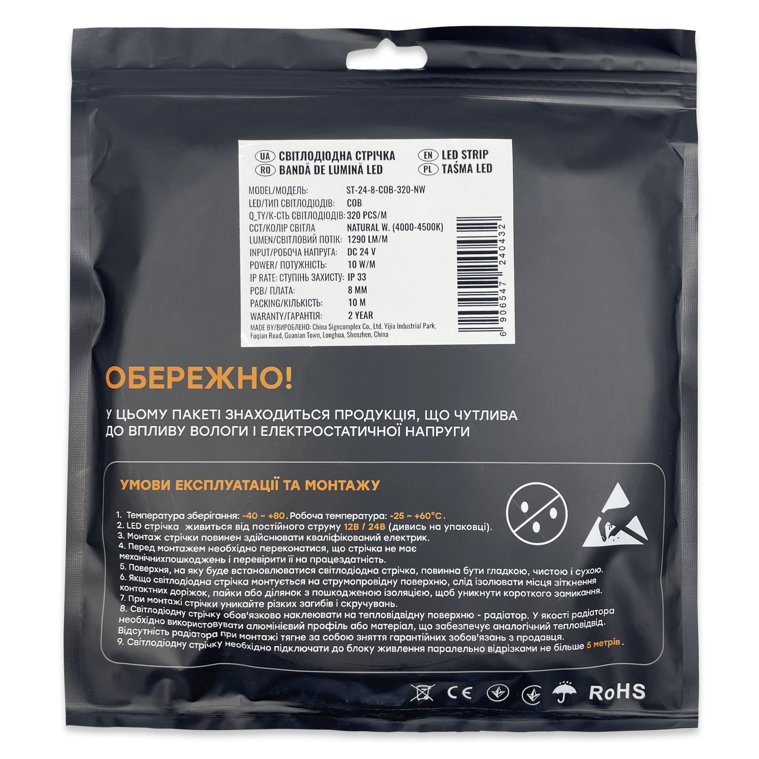 LED стрічка OEM COB 320шт/м 10W/м 24V 8мм IP33 (4000-4500К) 10 метрів ST-24-8-COB-320-NW 27341