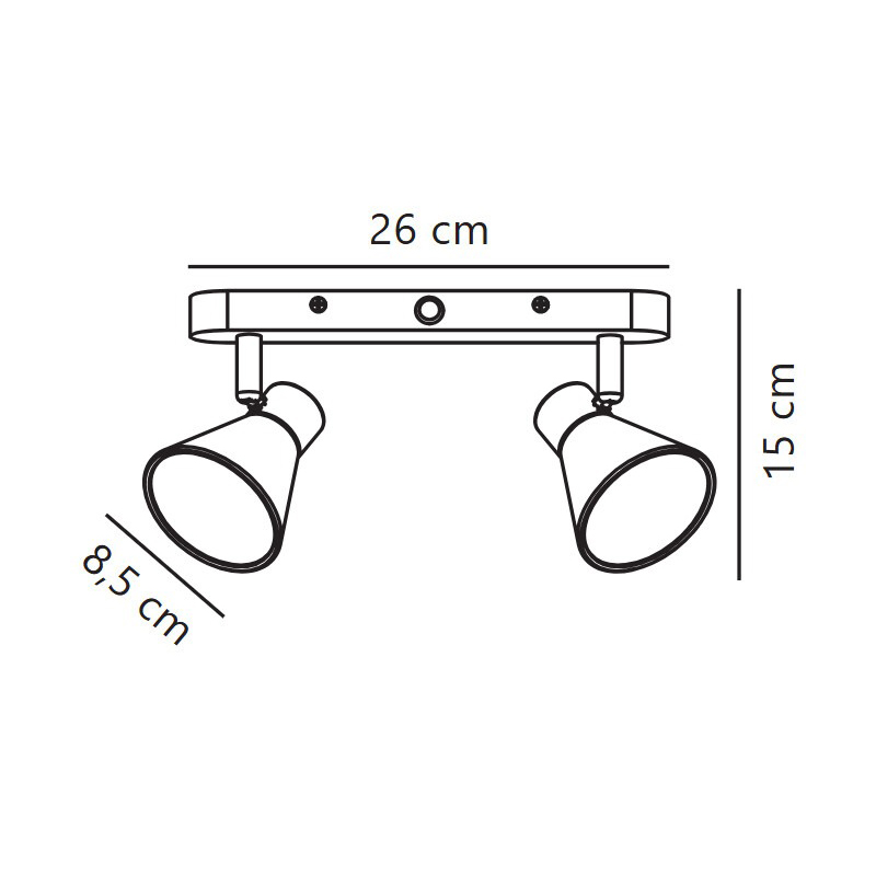 Світильник виготовлений із міцного металу, що гарантує довговічність та стабільність конструкції. Дві поворотні головки з цоколем GU10 забезпечують можливість налаштовувати напрямок освітлення під різні потреби: акцентне підсвічування, робоча зона або загальне освітлення.