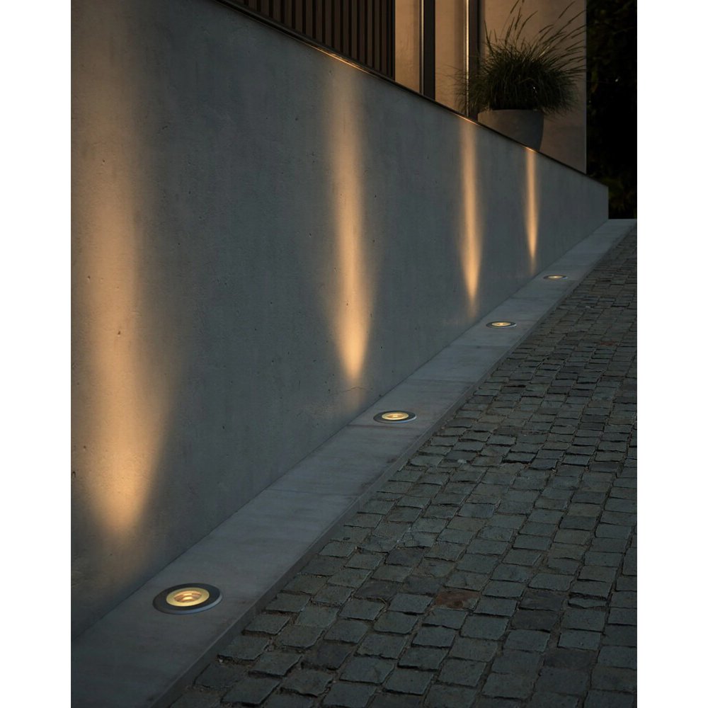 Міцний корпус з алюмінію та сталева конструкція плафона забезпечують надійність та стійкість до механічних впливів, що особливо важливо при монтажі у покриття тротуару або підлоги. Світильник не оснащений поворотним механізмом, працює зі стандартним патроном GU10 та підтримує можливість димування (з відповідною лампою та сумісним обладнанням).